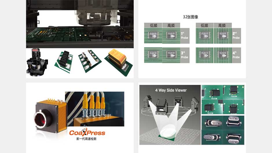 數(shù)字變頻投影技術(shù)利用4個3D發(fā)射頭獲取無盲點(diǎn)的3D圖像,結(jié)合高低頻摩爾條紋進(jìn)行組件高度檢測,應(yīng)用完整3D結(jié)合主相機(jī)進(jìn)行精確的檢測。