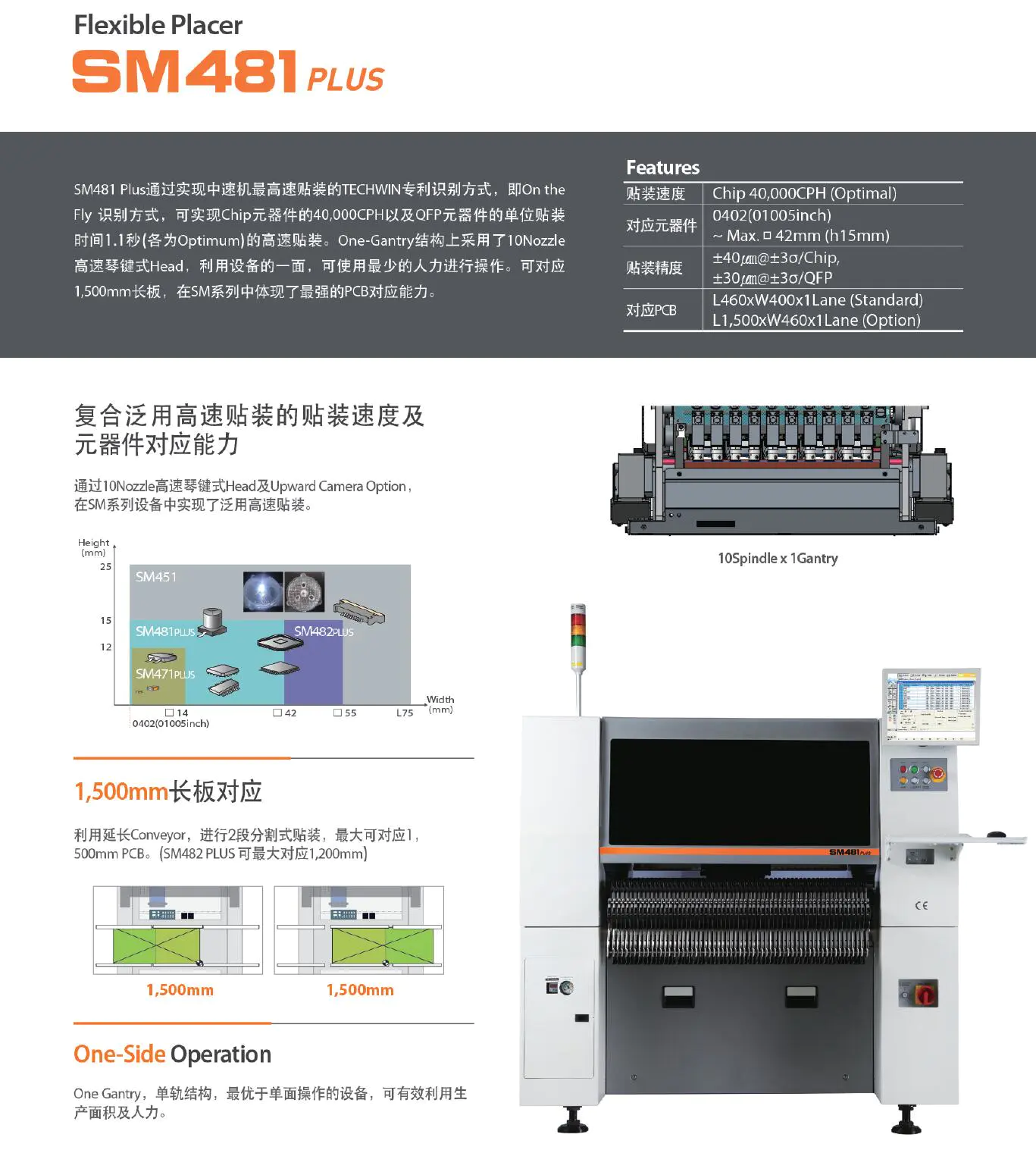 三星/韓華SM481PLUS是一臺中高速貼片機,SM481PLUS韓華貼片機主要分布2個元件識別區。 頭部飛行相機識別及固定高精度精密相機,單機可獨立完成所有產品貼裝。