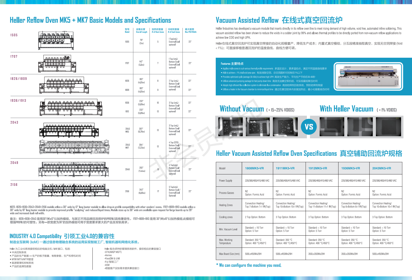 ● 采用最新低頂蓋設計,機器的表面溫度更低,環保節能 ● 優化的新型加熱模組,最高可減少氮氣消耗40% ● 革新的助焊劑回收系統,易更換清理 ● 極富靈活性的下降斜率,新型的強冷風冷卻模組可提供3度/秒以上的冷卻速率 ● HELLER 獨家專有能源管理軟件 ● 免費的一體化 CPK 軟件,三階數據管理 ● 工業4.0的兼容